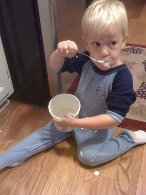Giant jar of Yogurt. I dished it out into little bowls and put the bowls on the table. When I turned around Max had pulled the container of yogurt off the counter, gotten a spoon out of the drawer and helped himself.